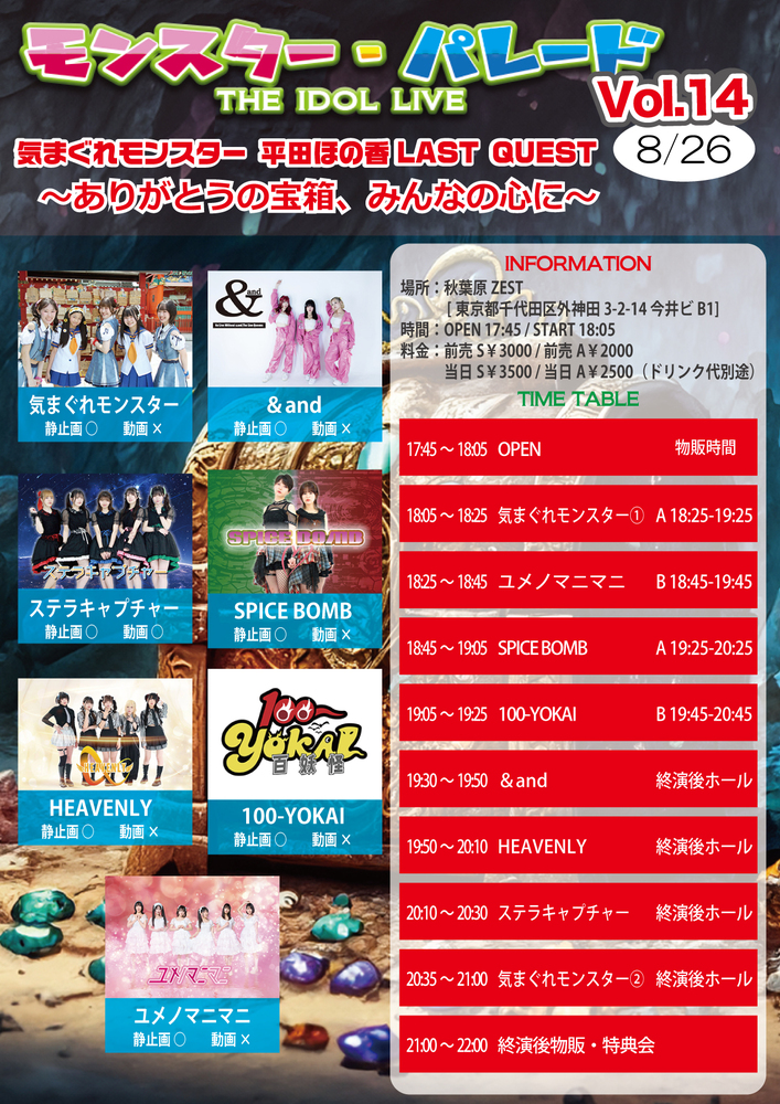 ◆8/26(火)モンスター・パレード Vol.15 =気まぐれモンスター 平田ほの香LAST QUEST~ありがとうの宝箱、みんなの心に~= 場所:秋葉原ZEST [東京都千代田区外神田3-2-14 今井ビルB1] 時間:OPEN 17:45/START 18:05 料金:予約Sエリア¥3000/予約Aエリア¥2000(ドリンク代別途) 出演:気まぐれモンスター / &and / ステラキャプチャー / SPICE BOMB / 100-YOKAI / HEAVENLY / ユメノマニマニ 【受付URL】https://t-dv.com/250826_ZEST ※8/20 18:00~8/26 15:00