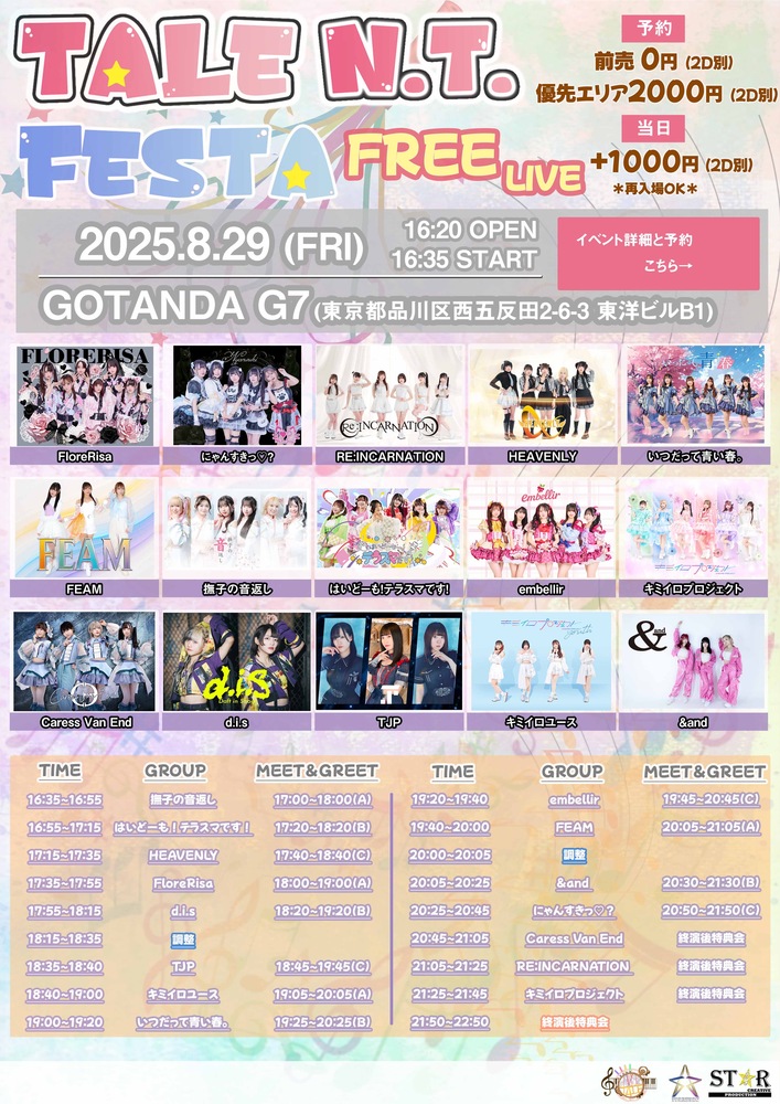 『TALE N.T. FESTA FREELIVE Vol.16』 日程:2025年8月29日(金) 時間:OPEN 16:20 / START 16:35 会場:五反田G7 料金:一般¥0/優先¥2,000 / 当日各+¥1000 (別途各+2D 1200円) チケッ予約:https://tiget.net/events/423604 (8/20(水)21:00〜)