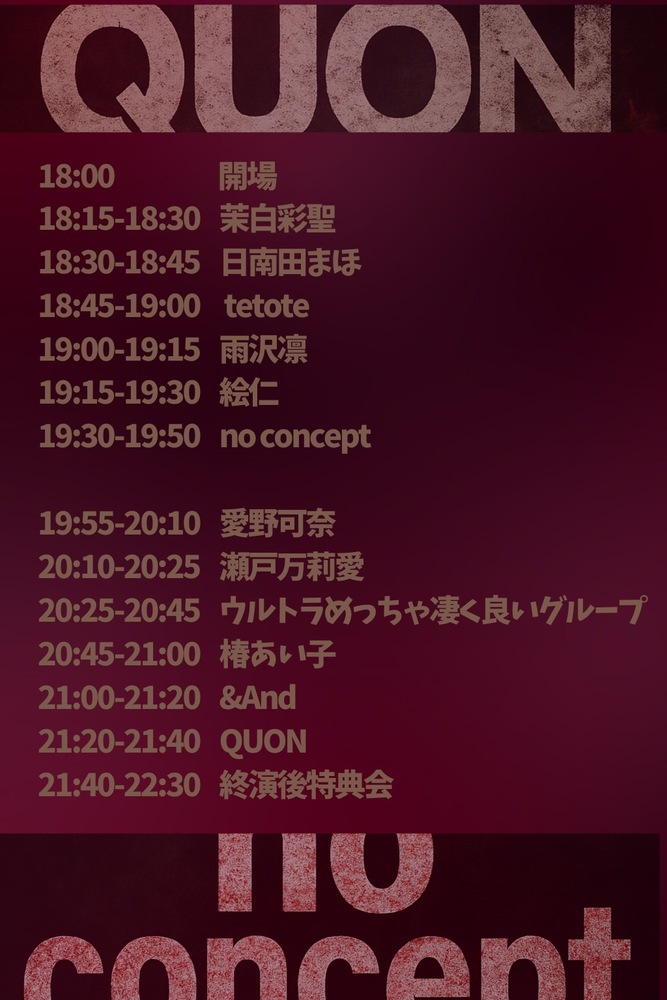 QUON×no concept共催ライブ 「QUONcept vol.01」 【日付】2025/9/3(水曜) 【会場】GOTANDA G3 【時間】開場18:15/開演18:45 【金額】予約2500円+1D600円 (当日券+500円) 【出演】&and,noconcept,QUON,瀬戸万莉愛,椿あい子,茉白彩聖,雨沢凛,愛野可奈,絵仁,tetote,日南田まほ,ウルトラめっちゃ凄く良いグループ, 【予約】https://tiget.net/events/422616 ※声出し/コールOK ※再入場OK