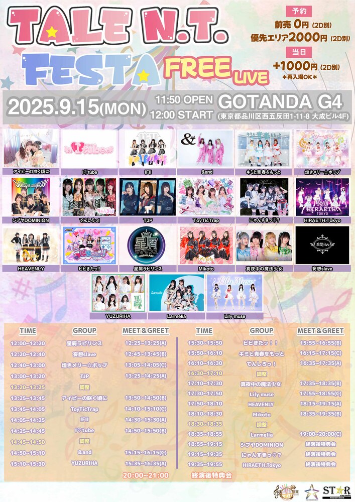 【&andライブ情報】9月15日(月)1公演目@GOTANDA G4 『TALE N.T. FESTA FREELIVE Vol.19』☆無銭エリアあり &and出演14:50~15:10(特典会15:15~16:15)