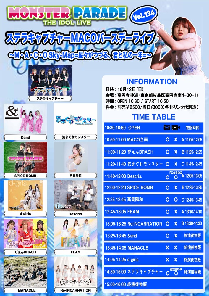 10月12日(日) 『MONSTER PARADE Vol.134 =ステラキャプチャーMACOバースデーライブ= ~M・A・C・O Sky-Map 星々がつづる、君と私の一年~』 会場:高円寺HIGH 時間:OPEN 10:30 / START 10:50 料金:予約¥2500/当日¥3000 (ドリンク代別途) 出演:&and/ステラキャプチャー/気まぐれモンスター、SPICE BOMB、髙貴陽和、d-girls、Descris、ぴえんBRASH、FEAM、MANACLE、Re:INCARNATION チケットURL : ticketdive.com/event/stellaMacoBD_LIVE (9/2 20時〜販売開始)