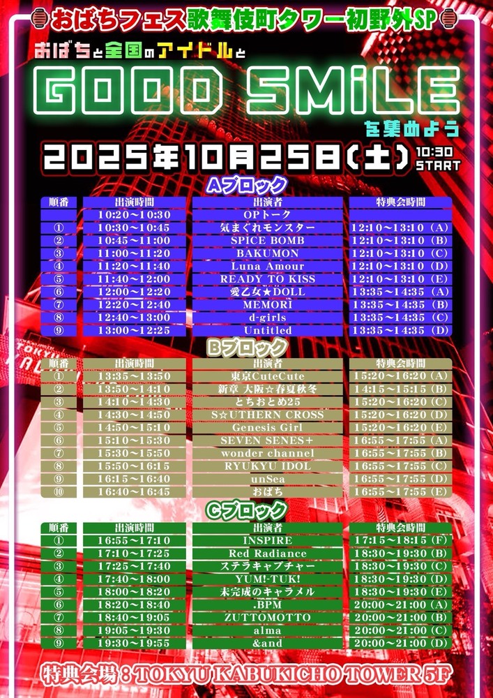【&andライブ情報】2025年10月25日(土)@KABUKICHO TOWER STAGE『おばちフェス歌舞伎町タワー初野外SP~おばちと全国のアイドルとGOOD SMiLEを集めよう』