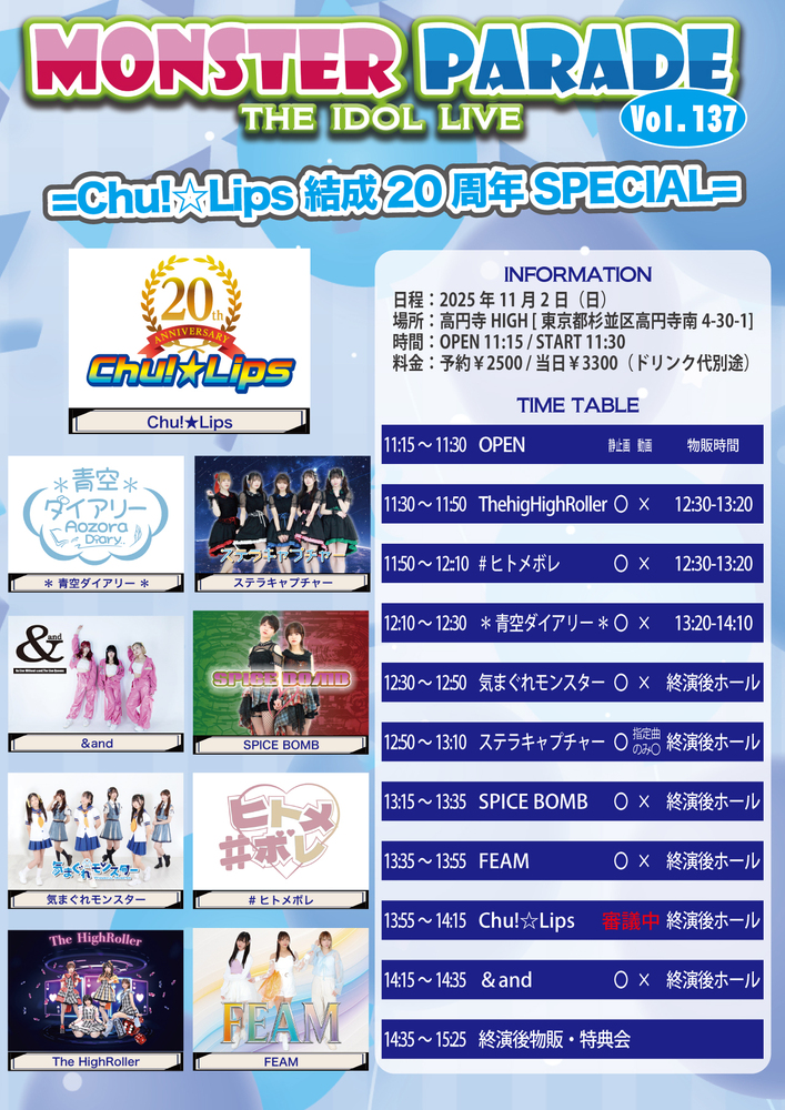 【&andライブ情報】11月2日(日)1公演目@高円寺HIGH『MONSTER PARADE vol.137 =Chu!☆Lips 結成20周年SPECIAL=』&and LIVE▶14時15分~14:35(特典会14:35~15:25)