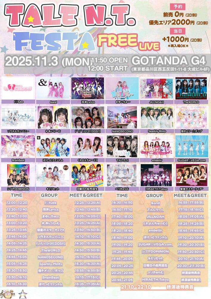 ■11/3(月祝)1公演目 『TALE N.T. FESTA FREELIVE Vol.23』 会場:五反田G4 料金:一般¥0/優先¥2,000 / 当日各+¥1000 (別途各+2D 1200円) チケッ予約:https://t-dv.com/talefreelive23 出演:&and/HIRAETH.Tokyo / ソラネルカンパニー / 泡沫Lyrics / てんしろっ! / シブヤDOMINION / NANOSECOND / まゆいちゅ〜 / ペリきゅらむ / くれよんちゅ~どく / キミリセット / BrainBeat / # あいり~む / 煌きメリー☆ボップ / I♡tube / Sparkly Mints / embellir / ディディスコッコ!!【DDS!!】 / ぽけっとファントム / JILLNOAH / SUGAR☆VEGA.com / 日曜日の起死回生 / 彗星のスターティア* / TheWORLD