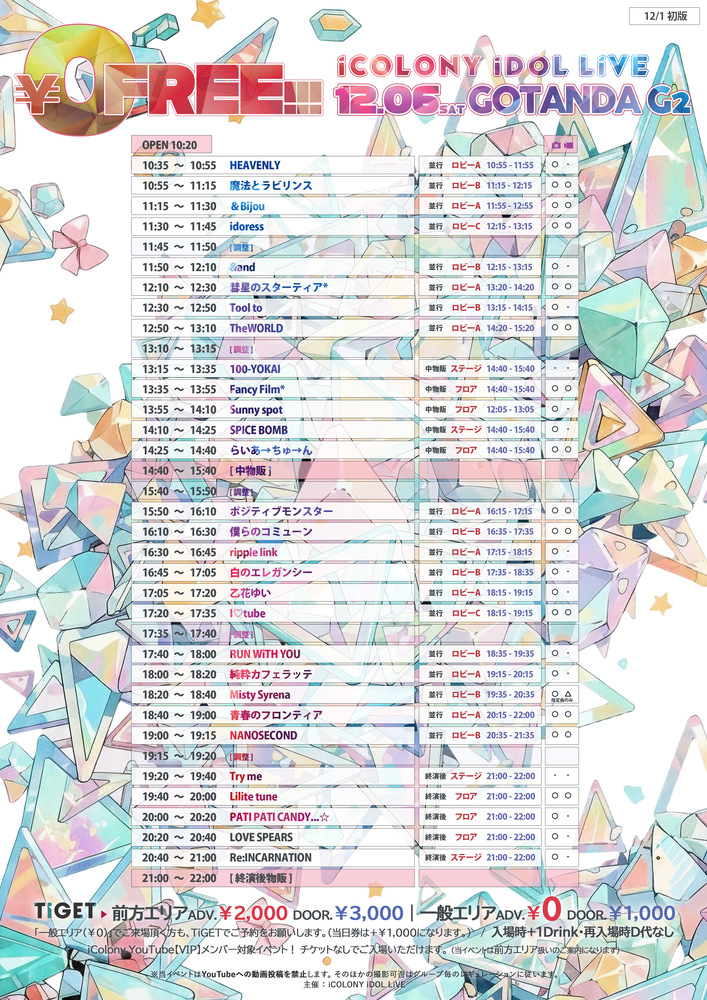 【&andライブ情報】12/6(土)1公演目@GOTANDA G2『FREE-iCOLONY iDOL Live』 ☆無銭エリアあり/11:50~12:10出演(特典会12:15~13:15)