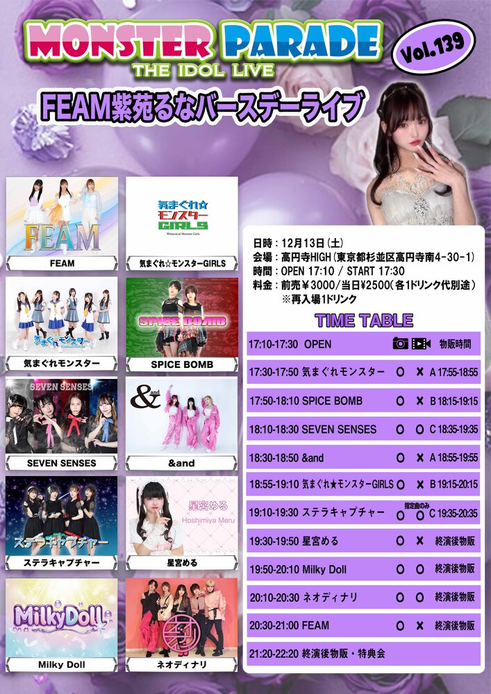 【&andライブ情報】12/13(土)2公演目@高円寺HIGH『MONSTER PARADE vol.139~紫苑るなバースデーライブ』ライブ18:30~18:50(特典会18:55~)